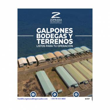 Alquiler de Bodegas, en el Parque Industrial cerrado ZOFRAMA, ubicado en el kilómetro 5,5 vía Montecristi la Pila. Perímetro controlado con cámaras de seguridad permanente, el precio es de 2,50 dólares por cada metro cuadrado de Bodega, adicional se considera una alícuota de 0,30 centavos de dólar. Bodegas disponibles, desde 600 metros cuadrados hasta 1500 metros cuadrados