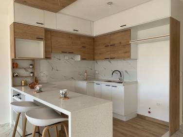 Cocina estilo americana con muebles altos y bajos