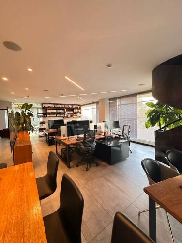 Las oficinas tienen pisos de porcelanato italiano estilo madera de color wengué y cielos rasos con bonitos acabados y luminarias de 2.8 m de altura con persianas en todas las ventanas. Las oficinas cuentan con una central telefónica IP con troncal de 10 líneas, cableado estructural para voz y datos, sistema de alarma de seguridad G4S y tienen las siguientes características y distribución totalmente amoblada y equipada como indican las fotos: