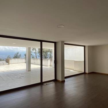 Amplia Sala y comedor con salida a una terraza de 106m2 con una espectacular vista del valle de Nayón, Cumbayá y Tumbaco
