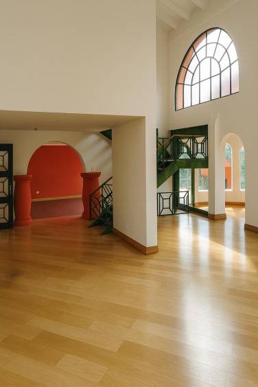 Descubre esta espectacular propiedad de estilo contemporáneo que combina amplitud, luz natural y detalles únicos. Al ingresar, te recibe un gran ventanal arqueado de doble altura que inunda de luz todo el espacio. Los pisos de madera natural aportan calidez y elegancia, mientras que la escalera de hierro forjado en verde y los detalles en rojo intenso crean un ambiente moderno y sofisticado.