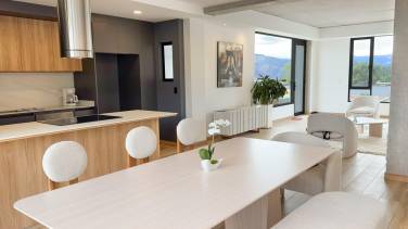 Con una superficie interna de 124,54 metros cuadrados y una amplia terraza de 32,79 metros cuadrados, el departamento se distingue por sus acabados modernos y elegantes. Los espacios están meticulosamente distribuidos en nueve habitaciones, ofreciendo comodidad y exclusividad. Las áreas incluyen dos suites, dos baños, un balcón, cocina, comedor diario, lavandería y terraza, además de una vista impresionante a la montaña. La propiedad es apta para mascotas.