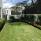 Jardín con sala exterior, pérgola y chimenea